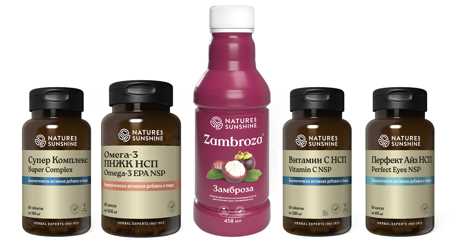 Продукты, вошедшие в программу для поддержки зрения, обладают наиболее полным набором этих ингредиентов. Перфект Айз НСП содержит витамины – А, С, пиридоксин, рибофлавин, каротиноиды – β-каротин и лютеин, биоэлементы – медь, цинк, селен и хром, а также таурин, пикногенол, экстракт черники, глутатион. Супер Комплекс – поливитаминный и полибиоэлементный продукт. Витамин С НСП – высокодозный пролонгированный источник витамина С и биофлавоноидов. Замброза – источник комплекса мощных антиоксидантов. Омега-3 ПНЖК – источник омега-3 полиненасыщенных жирных кислот.