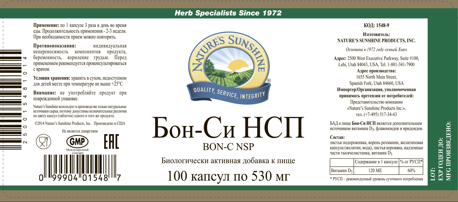 Бон-Си НСП оказывает противовоспалительное действие, показан при переломах, артрозах, привычных вывихах, кариесе и представляет собой комплекс, включающий: коровяк, подорожник, тысячелистник, рехманию, содержит витамин D3.