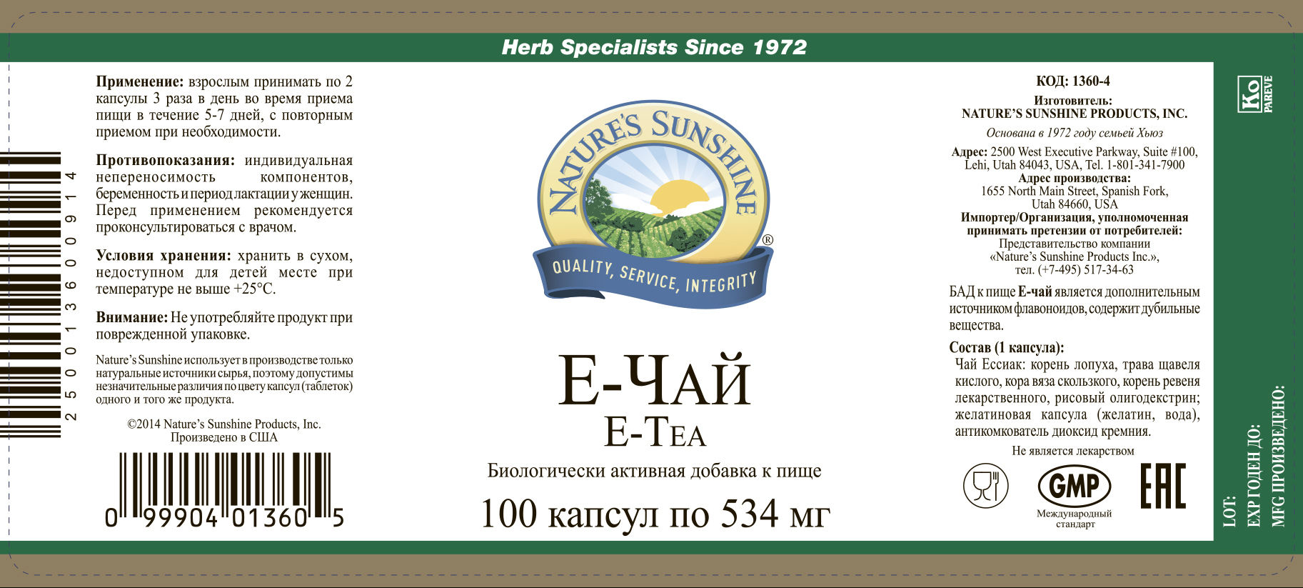 Канадская медсестра Рене Каиссе (1888–1978) узнала рецепт этого чая от одной из своих пациенток, утверждавшей, что она вылечилась от рака груди травяной смесью. Пациентка получила этот рецепт от старой индейской женщины. Два года спустя тёте Рене поставили диагноз «рак желудка и печени» и объявили безнадежной. Ее врач согласился на использование отвара, который предложила Рене. После двух месяцев использования чая женщина прожила еще 21 год. Рене Каиссе, усовершенствовав в 1922 году формулу, использовала этот фиточай для лечения тысяч пациентов с онкологическими заболеваниями, «приговоренных» традиционной медициной. В 1959 году врач президента США Д. Ф. Кеннеди доктор Чарлз Браск заявил, что Е-чай имеет заслуги в лечении рака. Компания NSP разработала уникальную методику обработки растительных ингредиентов, поместив их в капсулу. В состав чая входят четыре компонента: