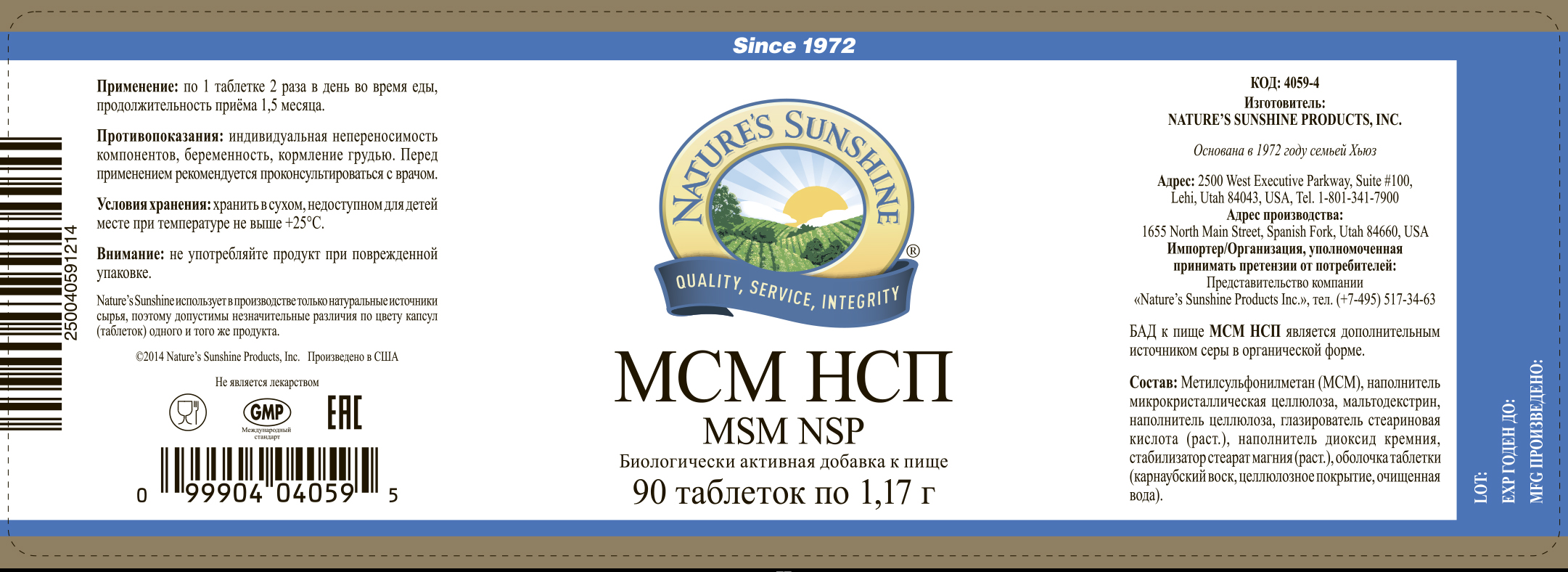1 таблетка содержит: метилсульфонилметан - 750 мг (255 мг серы в органической форме).
