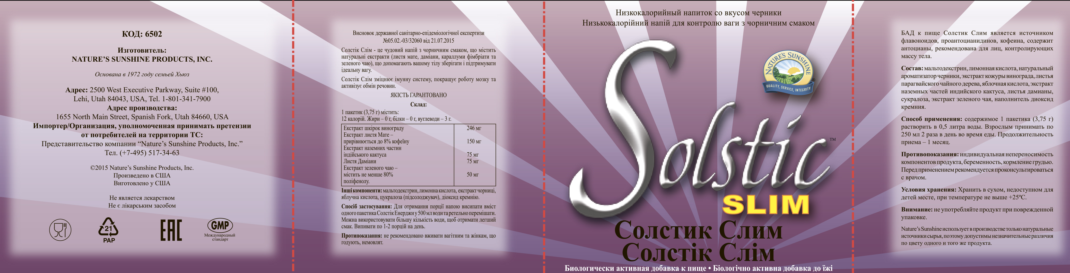 БАД к пище Солстик Слим является источником флавоноидов, проантоцианидинов, кофеина, содержит антоцианы, для лиц, контролирующих массу тела.